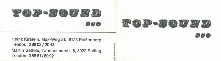 Wir konnten dann auch mit 2 Gitarren spielen, z.B. auch den Sound der Shadows und Spotnicks - damals sehr bekannte Instrumentalgruppen. Klang bereits sehr gut und wir hatten viel Spaß dabei. Der Bandname war dann absolut logisch und nannten uns TOP SOUND DUO, in Anlehnung an die Orgel - oder konnte man es bereits digitales Keyboard nennen. Wir hatten prima Auftritte und mit Martin war es immer unkompliziert, denn er war auch ein hundertprozentiger zuverlässiger Freund und Musikkollege.